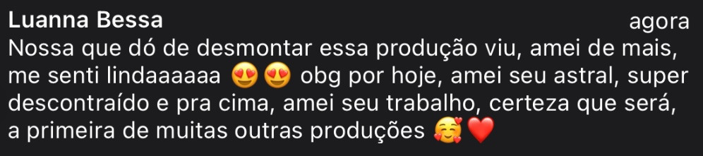 - A produção de cabelo e maquiagem acontece da seguinte forma: sendo elas completas ou avulsas mediante necessidades do cliente. Sendo avulso só mediante a pacote acima de 4 pessoas.